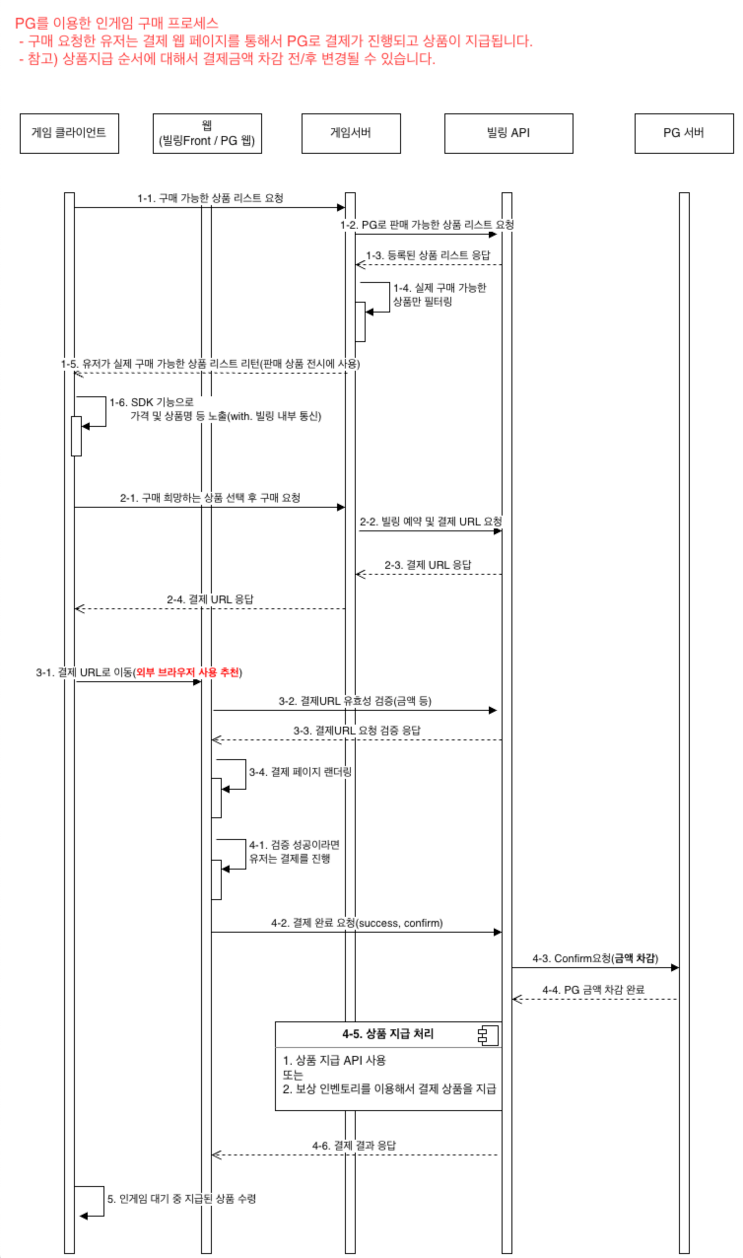 - 결제가 정상적으로 완료되면, 빌링 시스템이 게임 서버에서 제공하는 상품 지급 API를 호출하거나 인벤토리 시스템에 지급합니다.