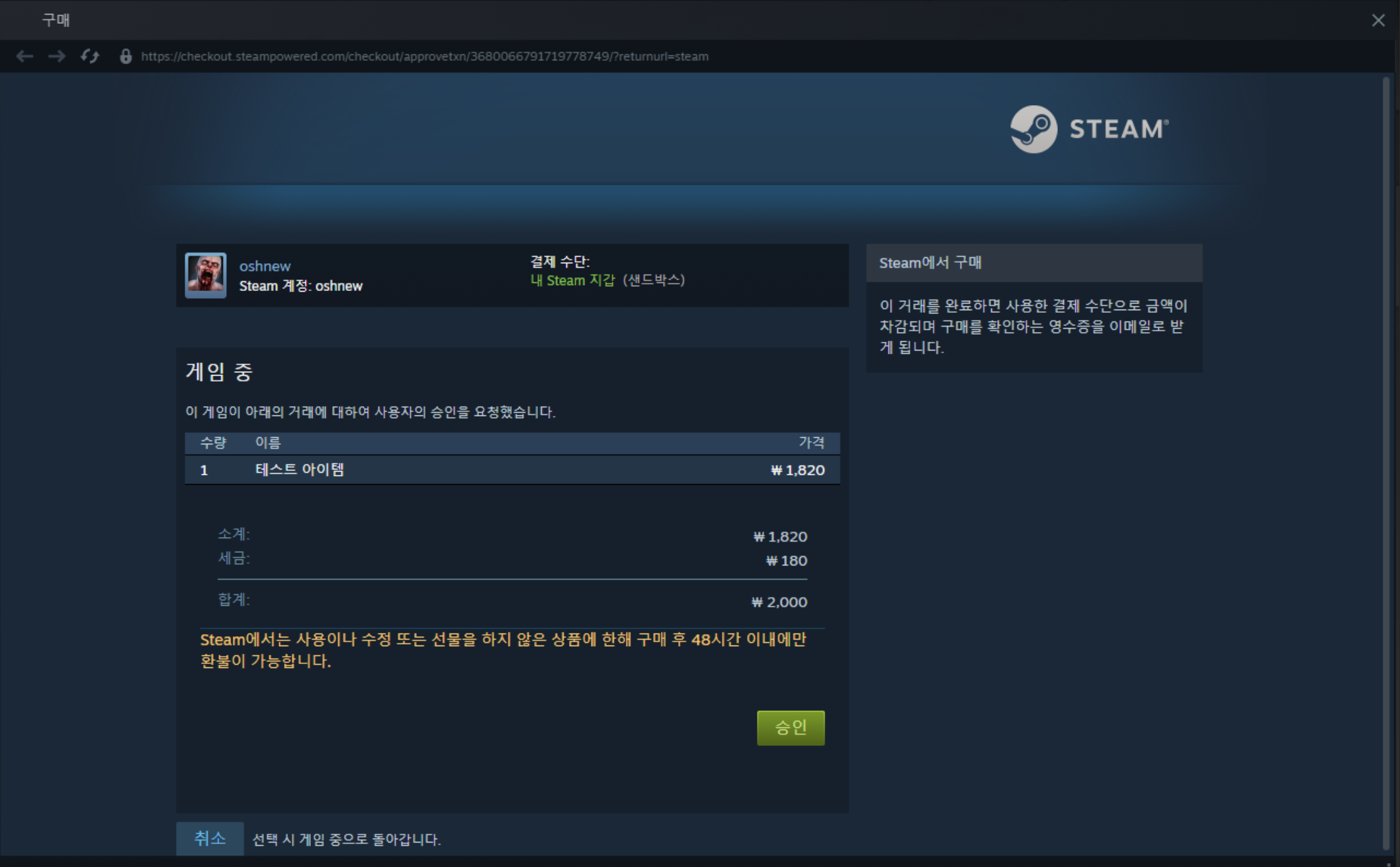 Steam에서 소액 결제 기능에 대해서 SandBox 기능을 지원합니다.
