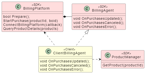 SDK에서는 단일한 인터페이스(BillingPlatform.StartPurchase)를 통해서 지불을 시작할 수 있도록 이러한 함수들을 대리자를 통해 등록받고 있습니다.
