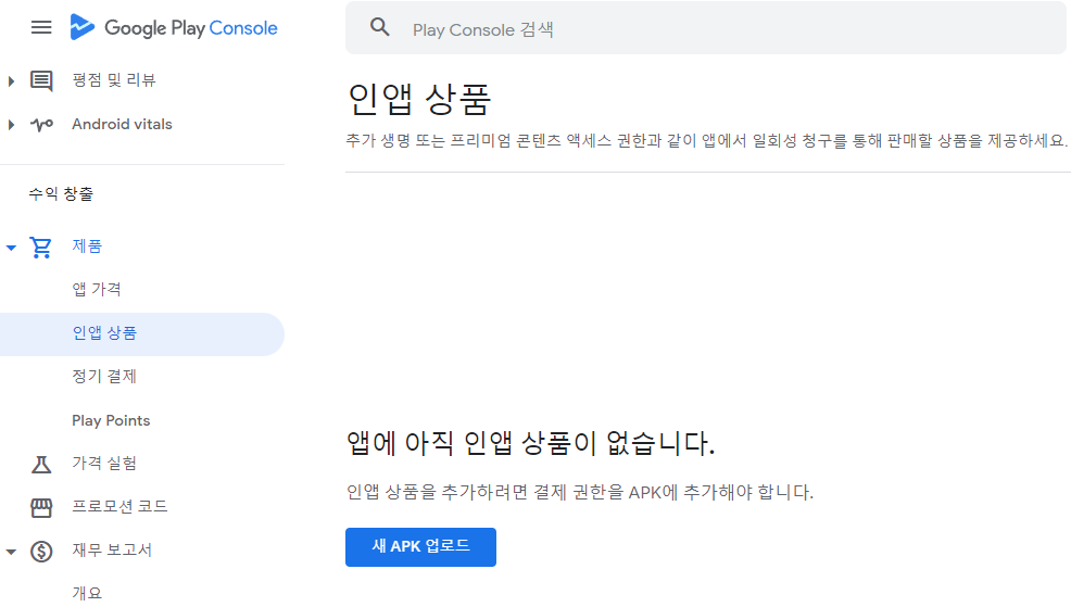 [새 APK 업로드] 버튼이 보이는 경우 결제 라이브러리를 포함한 빌드를 업로드 해야합니다.